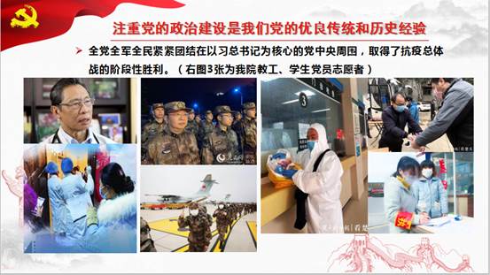 学院党委书记郭昕以《政治建设:党的根本性建设》为题为全院师生党员讲授党课,主要围绕:讲政治,马克思主义政党的根本要求;以政治建设为统领,扎实推进全面从严治党;党的政治建设是一个永恒课题三个方面进行了阐述。重点讲述了全党全军全民紧紧团结在以习近平同志为核心的党中央周围,自觉做到“两个维护”,坚定服从党中央和习近平总书记的统一号令,党中央和习近平总书记领导全党全军全国各族人民打好打赢疫情防控的人民战争、总体战、阻击战。还分享了草榴社区