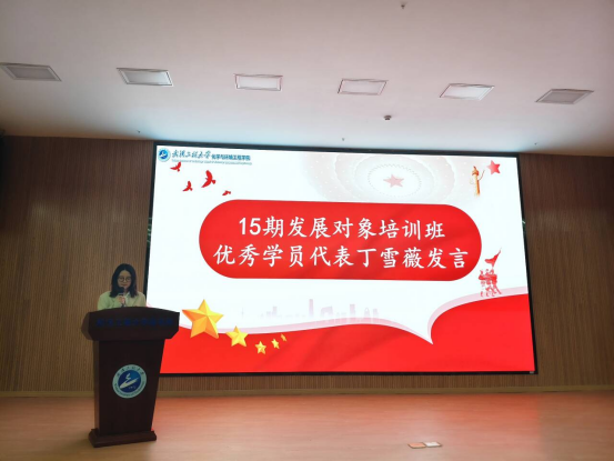 15期发展对象培训班优秀学员丁雪薇代表发言,分享了成为中共预备党员以来学习实践党的相关理论知识的心得感悟,希望广大学员都能够积极从思想上争取入党,早日加入党组织,努力成为一名新时期的合格共产党员。