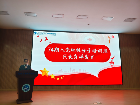 74期入党积极分子培训班学员肖洋代表全体学员郑重承诺,会珍惜这次党校培训的机会,认真学习,在工作学习和社会生活中起先锋模范作用,用实际行动和优异成绩接受党的考察和检验,争取早日加入中国共产党,为实现共产主义奋斗终身。