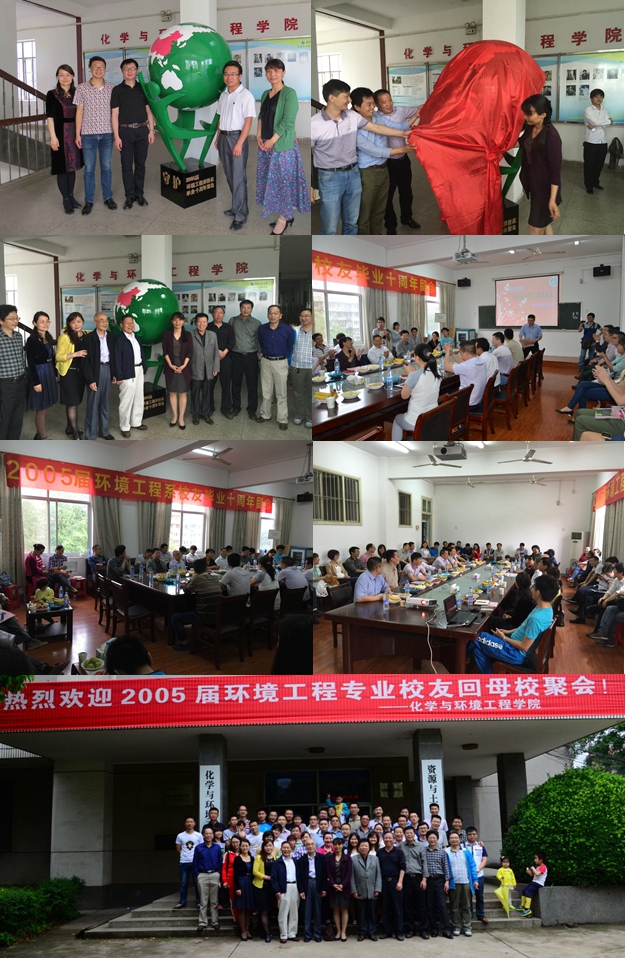 2005届环境工程专业校友毕业10周年回母校聚会,并在学院会议室召开了师生交流座谈会。05届环境工程专业1、2、3班共51名校友,学院党委书记刘汉红,院长陈嵘,党委副书记徐迪迪,副院长毕亚凡,职教院党委副书记聂绪学,原班主任、总务处副处长严京海,环境工程专业刘大银、孙家寿、杨嘉谟、余训民、汤亚飞、张莉、梅明、李庆新等8位教授,学院党务干事陈云老师及12级环境工程专业学生代表参加了座谈会。会议由05届环境工程学生代表徐峰主持。