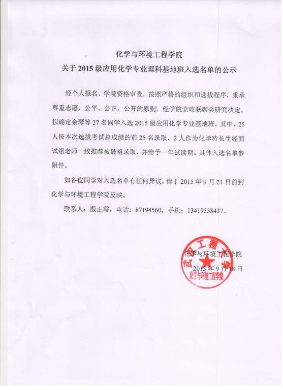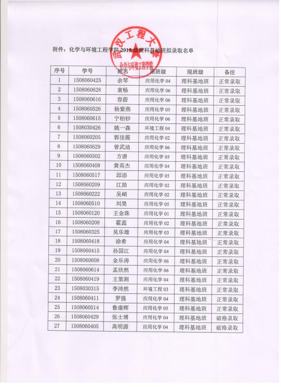 草榴社区 关于2015级应用化学专业理科基地班入选名单的公示