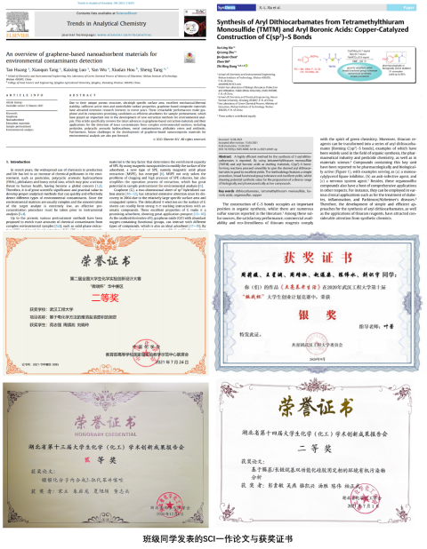 学院积极推动本科生导师制,“以赛促教、以赛促学、以赛促练”,把学生早早“交到”专业导师手中,早早“送进”实验室和科研项目中,全面提升学生的创新能力和科技素养,努力提高学生未来竞争的核心职业能力。同时,学院高度重视“互联网+”全国大学生创新创业竞赛、全国大学生化学实验技能竞赛,全国大学生化学实验创新设计大赛等学科竞赛。班级同学积极参与,取得了喜人的成绩。其中,黄涛同学以第一作者在国际学术期刊上发表SCI收录论文1篇,夏旭领、朱启龙同学以共同第一作者在国际学术期刊上发表SCI收录论文1篇,苑志强、白亦可均以第四作者发表SCI论文共2篇,董双凤以第三作者发表中文论文1篇。苑志强、周靖淞、刘晓玲同学组队参加第二届“微瑞杯”全国大学生化学实验创新实验设计竞赛并荣获华中赛区二等奖1项。全班多名同学参加湖北省第十三届、第十四届大学生化学(化工)学术创新成果报告会,并荣获一等奖1项,二等奖2项,三等奖2项。周靖淞同学在多次参加创新大赛,并荣获2020年“互联网+”金奖1项、铜奖2项,荣获2021年“互联网+”银奖1项,2021年“挑战杯”红色专项活动二等奖1项,2020年“挑战杯”获银奖1项。董双凤同学荣获草榴社区