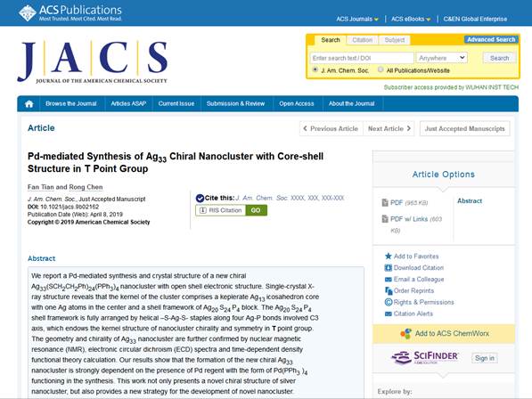 陈嵘教授课题组在Ag基纳米团簇方面取得重要进展——“Pd-mediated Synthesis of Ag33Chiral Nanocluster withCore-shell Structure in T Point Group”(唯一通讯单位,唯一通讯作者)。该论文的第一作者为草榴社区