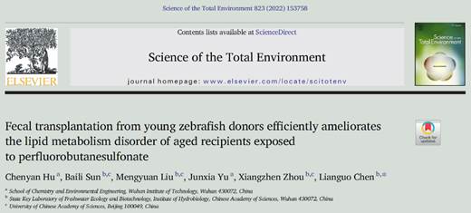 胡陈艳博士与中国科学院水生生物研究所陈联国研究员利用斑马鱼为模式生物,通过移植年轻斑马鱼粪便到老年斑马鱼,发现粪菌移植可彻底拮抗PFBS的内分泌干扰效应和生殖毒性,将老年个体的内分泌系统重塑为年轻表型,促进卵子发育,提高繁殖能力。同时,另一工作也发现粪菌移植可以显著促进老年个体的生长,减轻老龄化及PFBS引起的肝组织损伤。对老年动物的脂质代谢能力也具有显著激活能力,能有效地抑制由老龄化或/和PFBS引起的代谢异常,将血液甘油三酯的浓度恢复至年轻动物的水平(此工作发表于另一Top期刊Science of the Total Environment(Hu et al, 2022, 823, 153758;IF:10.753))。以上研究为粪菌移植在环境与健康领域的应用提供了新的思路,将助力粪菌移植成为污染物毒性干预及健康老龄化的新策略。