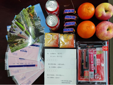 学院领导班子为同学们送上了带有“一研为定”和“金榜题名”字样的考研加油包,加油包里面的物品寓意满满,包括代表“金榜题名”的文具套装,“心想事成”的橙子、“平安如意”的苹果、“巧克难题”的巧克力、学弟学妹们亲笔手写的祝福卡片、满满校庆元素的防疫口罩等,表达了学院领导对考研学子的殷切祝福,助力同学们以更好的状态备战考试。
