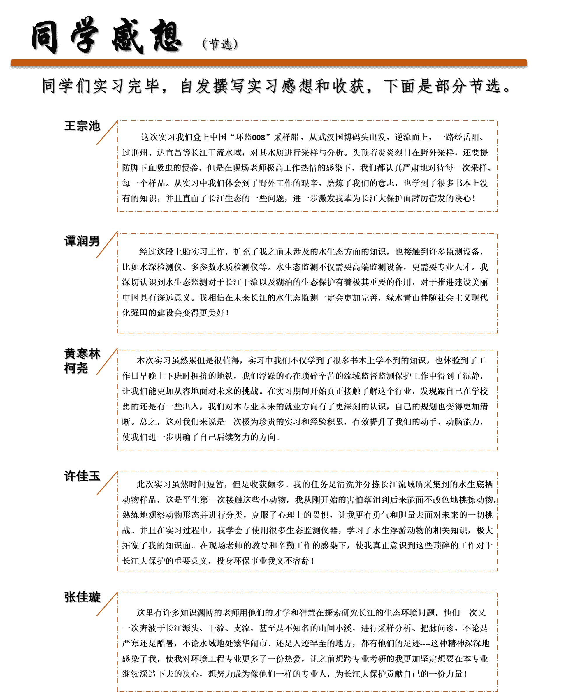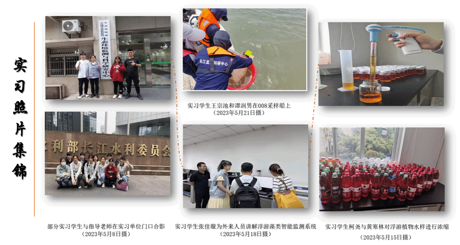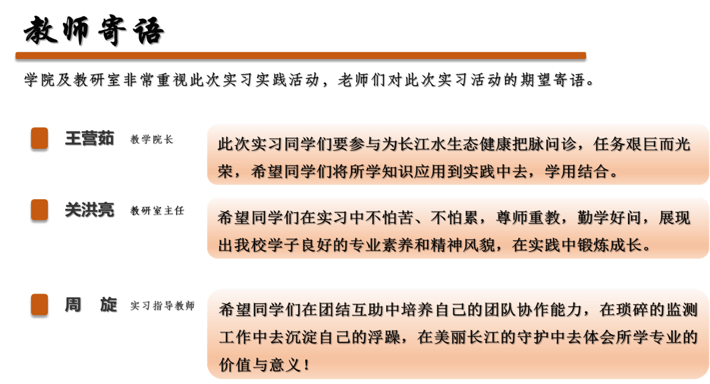 实习期间,同学们早出晚归坐地铁往返于学校,每次约3小时,上船外出采样吃住都在船上,尽管如此辛苦,同学们觉得能利用所学专业知识亲身参与到长江大保护的各个岗位,感到异常兴奋。在为期一个月的实习结束后,同学们非常不舍,纷纷表示此次实习收获良多、受益匪浅,不仅扩充了水生态方面的知识,开阔了眼界,让自己浮躁的心在琐碎繁杂的流域监督监测工作中得到了沉淀,在逆流而上的采样船上见证了长江浪涛拍岸的气势和水天相接的娴静,对习近平新时代中国特色社会主义思想,特别是习近平生态文明思想有了更深刻认识,也真正体会到了美丽中国建设的责任与义务、自豪与光荣!
