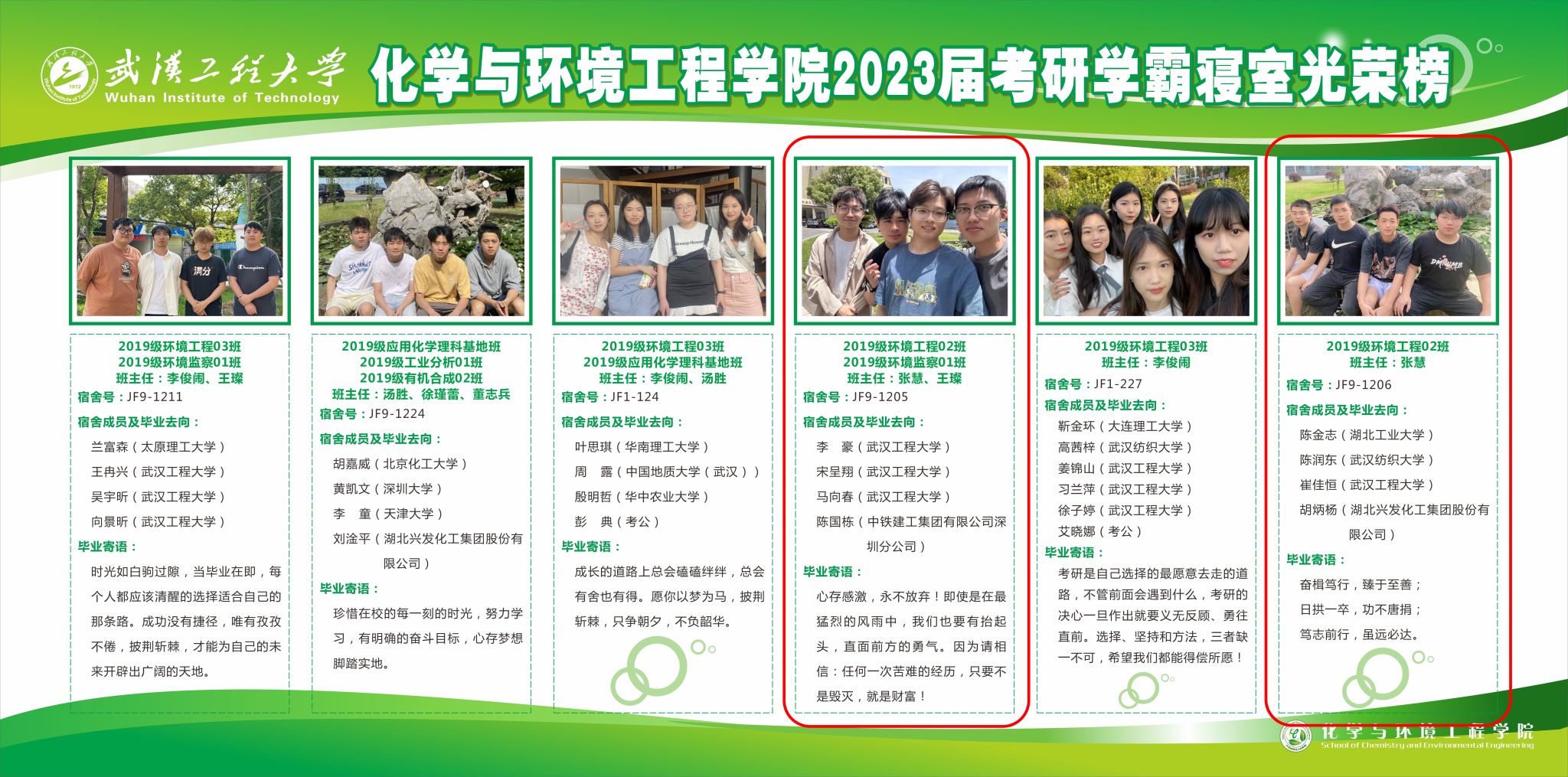 受疫情影响,考研之路异常艰难,班级形成了以寝室为单位的“抱团复习”,规律作息,相互监督、相互鼓励、共同进步的良好学习氛围。期间,张慧老师也多次查访,挨个电话和短信沟通,及时了解班级考研学子的困难和学习状态,是否转阳,是否需要帮助,尽量为大家排忧解难。考研结束,班级取得了可喜的成绩,一些同学顺利考入双一流、211等重点高校。如胡兴宇考入厦门大学,王菲考入中国地质大学(武汉),卫丁瑞考入中国海洋大学,郭培芸和胡思琪考入华中农业大学,李豪取得2019级环工专业五个班考研最高分(392分)的好成绩,成为我校环工专业研究生。班级的“抱团学习”取得了良好效果,教辅9-1205和教辅9-1206两个班级寝室荣登学院2023届考研“学霸寝室”光荣榜。