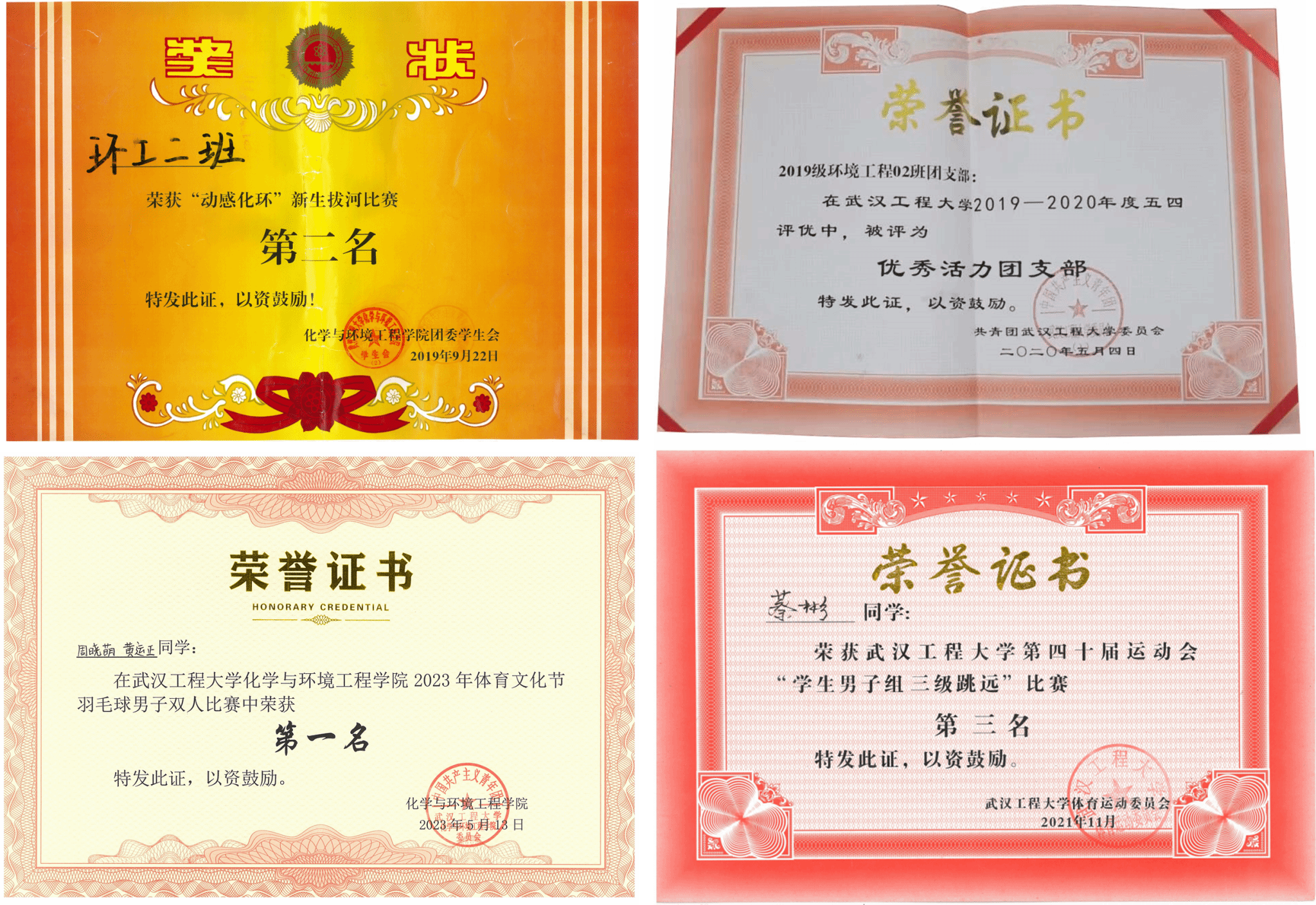 班级同学团结友爱,有强烈的集体荣誉感,2019年开学季班级荣获“动感化环”新生拔河比赛第2名,2020年班级荣获“优秀活力团支部”;李宁和蔡彬两位同学分别荣获学校第三十九届和第四十届运动会单项项目第7名和第3名;周晓萌、黄运正两位同学荣获学院体育文化节羽毛球双人比赛第1名。