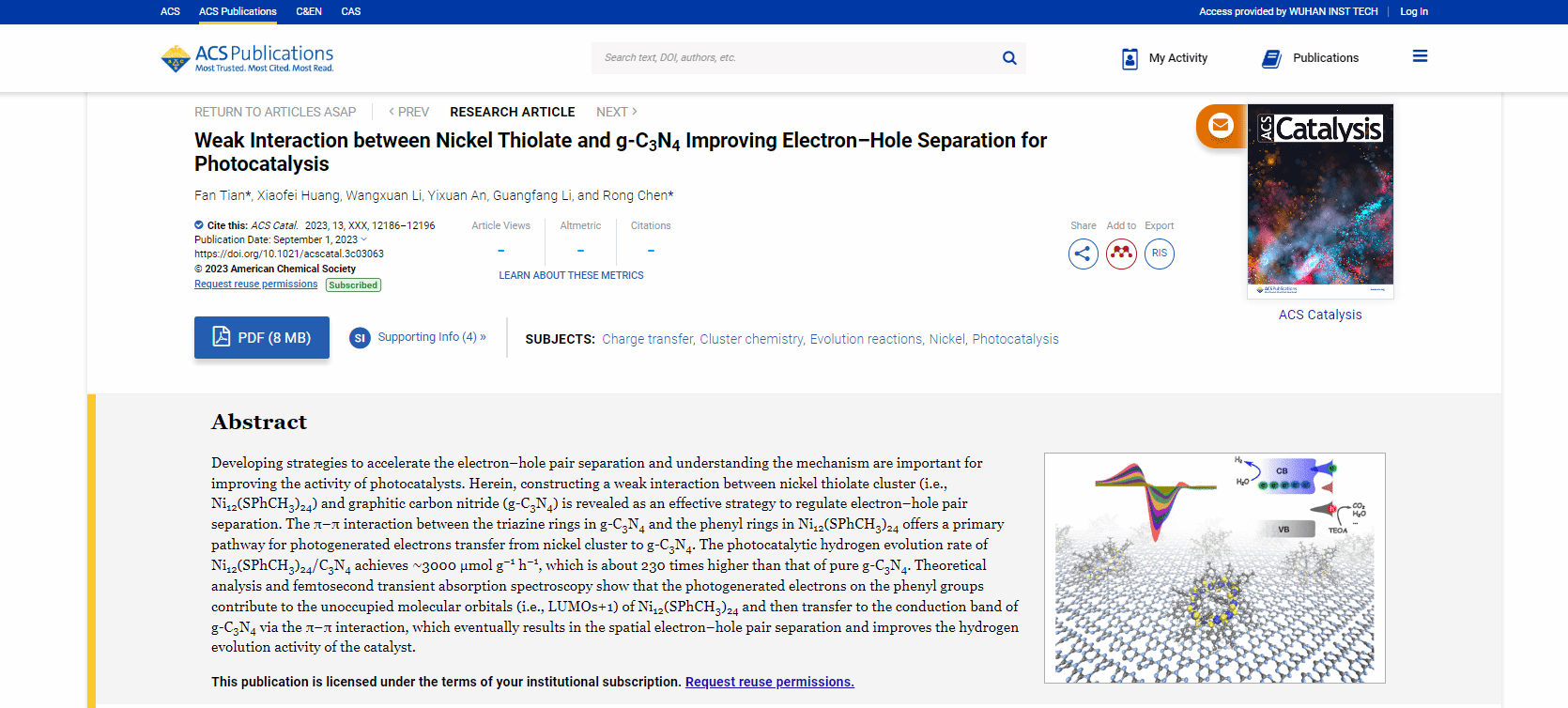 (通讯员:程然)近日,化学类国际著名刊物《ACS Catalysis》在线发表了我校青年教师田凡博士课题组题为“Weak interaction between nickel thiolate and g-C3N4 improving electron-hole separation for photocatalysis”的研究论文。该论文以对甲基苯硫酚为配体成功合成一种全新的环状Ni12团簇,将该团簇与g-C3N4通过简单的旋蒸方法复合,其光催化产氢活性在紫外光下可达纯相材料的230倍。结合理论计算与飞秒瞬态光谱表征研究了其光催化活性提升机制,发现Ni12团簇中配体苯环的存在对于其光催化活性提升至关重要。其通过与g-C3N4之间形成p-p堆积,沟通Ni12团簇中金属部分与g-C3N4之间的电荷转移,实现复合材料光生电子与空穴的有效分离,从而提高催化活性。结合理论与实验结果,作者提出了一种基于弱相互作用提升光生电子与空穴分离效率的策略,为高效光催化剂的设计提供了新的思路。该论文第一作者与通讯作者为田凡博士,草榴社区
