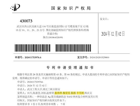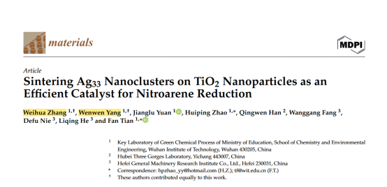 题为“Sintering Ag33 Nanoclusters on TiO2 Nanoparticles as an Efficient Catalyst for Nitroarene Reduction”的研究论文在前期团簇负载TiO2催化硝基芳烃还原工作(Inorg. Chem., 2023, 62, 17668-17677, Inorg. Chem., 2024, 63, 8958-8969;Inorg. Chem., 2024, 63 (37), 17176-17187)基础上,将简单负载的Ag33/TiO2在氮气条件下进行高温煅烧,引起团簇表面有机配体攫取TiO2中的晶格氧,生成CO2、SO2和H2O气体溢出,最终形成一种具有丰富氧缺陷的Ag簇负载TiO2样品。得益于其中Ag的存在,该样品在室温条件下能够快速催化硼氢化钠还原硝基芳烃,其催化活性为未经煅烧处理的Ag33/TiO2的近二十多倍。该论文发表在中科院材料科学类三区期刊《Materials》上,论文的第一作者为2021级应用化学专业本科生张伟华与杨雯雯(共一)。其中材料的合成与催化部分以题为“一种非晶态Ag簇负载缺陷态TiO2纳米复合材料及其应用”的专利被受理(申请号:202411753976.6),相关同学均为权利人。