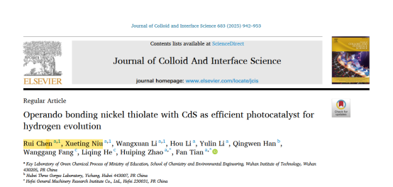 题为“Operando Bonding Nickel Thiolate with CdS as Efficient Photocatalyst for Hydrogen Evolution”的研究论文在课题组前期Ni基团簇光催化析氢的研究基础(Appl. Catal., 2021, 292, 120158;ACS Catal., 2023, 13, 12186-12196)上,创新性的发现Ni-S基团簇在CdS表面的助催化活性得益于团簇在催化过程中的原位脱配体效应。该过程使得Ni-S团簇暴露一部分的Ni位点,进而通过与CdS表面的S成键锚定于载体材料表面,通过强相互作用促进光复合材料中的光生电子与空穴的分离。该论文发表在中科院化学大类一区TOP期刊《Journal of Colloid and Interface Science》上,论文的第一作者为2021级应用化学专业本科生陈睿与牛雪婷(共一),2022级应用化学专业本科生李侯与李昱霖参与其中的材料合成与活性评价工作。