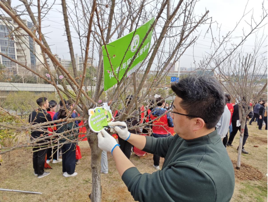栽种的树苗挂牌。汪伟对学院师生的积极参与表示肯定,并强调:“每一株树苗都是绿色校园的见证者,更是师生情谊与奋斗精神的象征。”