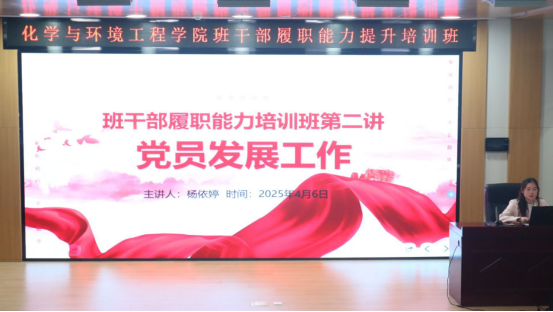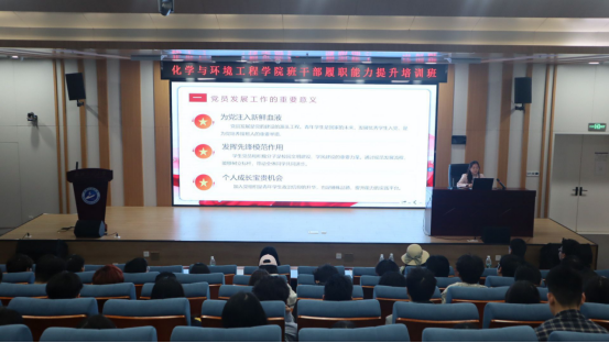 在综合楼102报告厅举办班干部履职能力培训班第二讲,学院党委副书记许守飞、全体辅导员及班长、团支书、学习委员参加讲座。本次培训以“规范党员发展工作,夯实基层组织建设”为主题,由学院党务干事杨依婷担任主讲,围绕党员发展工作的核心要点进行系统讲解。
