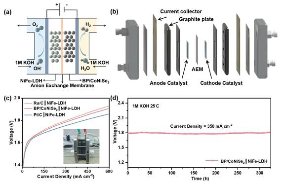 该研究设计了一种界面内建电场(BIEF)可调的新型黑磷/硒化钴镍(BP/CoNiSe2)异质结,通过两者显著功函数差异,构建定向界面内建电场,调控Co/Ni位点d带中心下移,优化氢吸附/脱附能垒。最优催化剂在10 mA cm-2电流密度下过电位低至82 mV;集成至阴离子交换膜水电解槽(AEMWE)后,在1.79 V电压下实现350 mA cm-2的高电流密度并稳定运行320小时,性能优于多数已报道的钴/镍基催化剂。这一研究通过构建黑磷/CoNiSe2异质界面内建电场,实现Co/Ni活性位点电子结构的精准调控,大幅提升碱性析氢反应效率及阴离子交换膜水电解稳定性,为BIEF介导的异质结设计提供了新的研究范式。