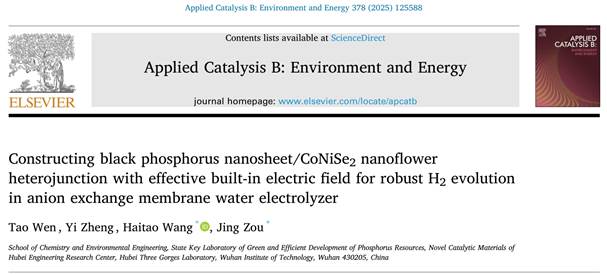 “催化与固废协同创新团队”在催化和能源领域国际权威期刊《Applied Catalysis B: Environment and Energy》(影响因子:20.3,中科院一区TOP,DOI:10.1016/j.apcatb.2025.125588)在线发表了题为“Constructing black phosphorus nanosheet/CoNiSe2 nanoflower heterojunction with effective built-in electric field for robust H2 evolution in anion exchange membrane water electrolyzer”研究论文。草榴社区
