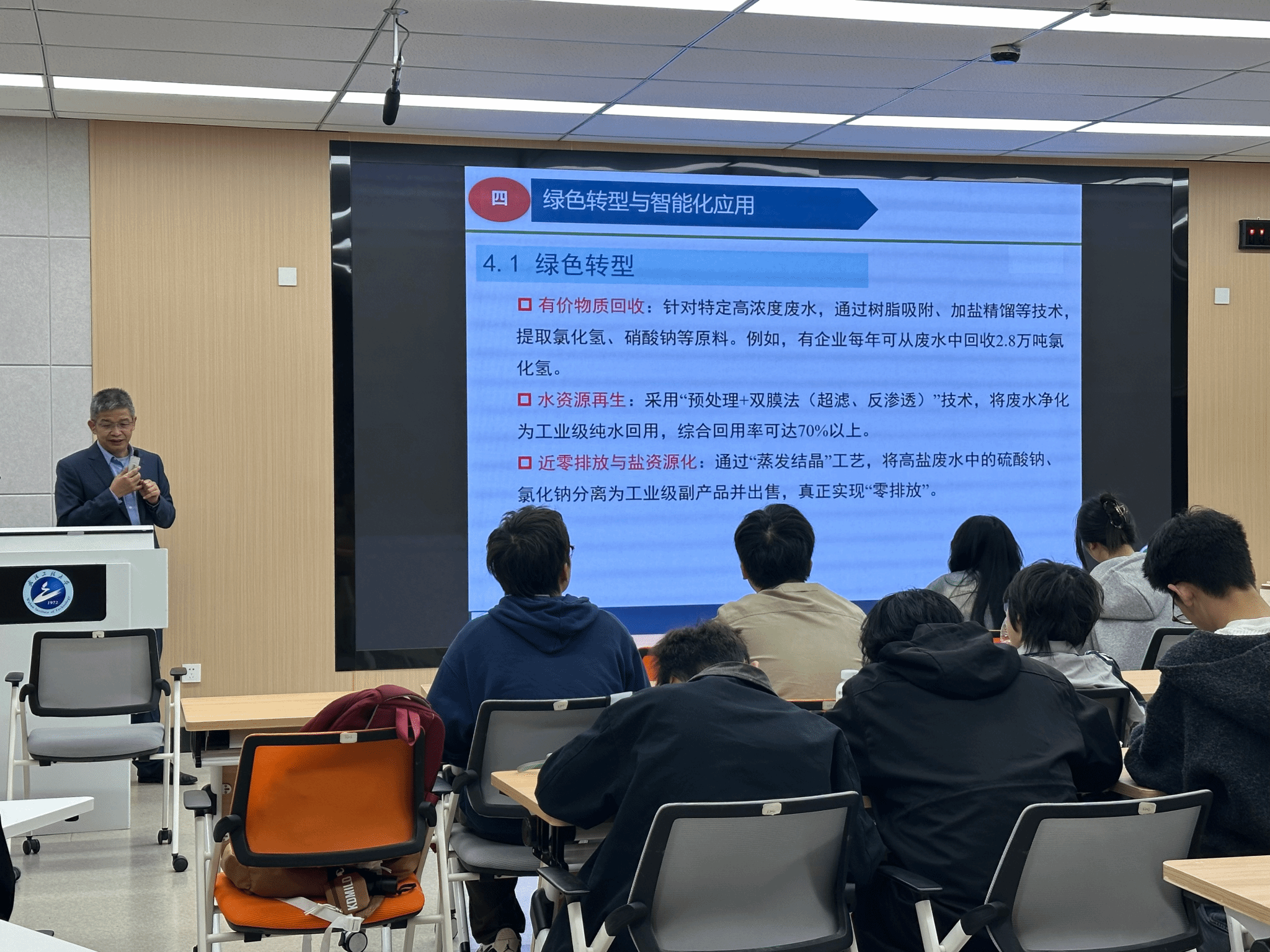 最后,杨文斌教授展望了精细化工废水处理的未来发展方向。一方面,技术层面将从“达标排放”走向“极致资源化”,废盐资源化、酸碱回收、水回用率超95%将成为常态;另一方面,模式层面将从“企业单干”走向“跨行业耦合”,如化工-氯碱耦合模式,将精细化工废盐净化后直接作为氯碱企业原料,实现双赢。“精细化工废水处理已不再是单纯的环保达标问题,而是化工工艺优化、资源循环利用、碳排放核算等综合工程。”杨文斌教授寄语在场学生,“未来的环保工程师需要具备‘化工+环境’的复合知识结构,希望大家扎实学习基础理论,掌握先进技术,为我国化工行业的高质量、绿色化发展贡献力量。”