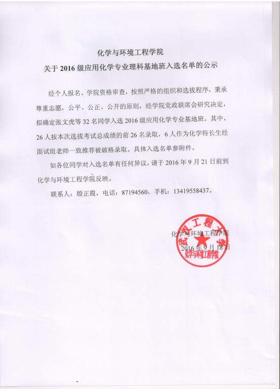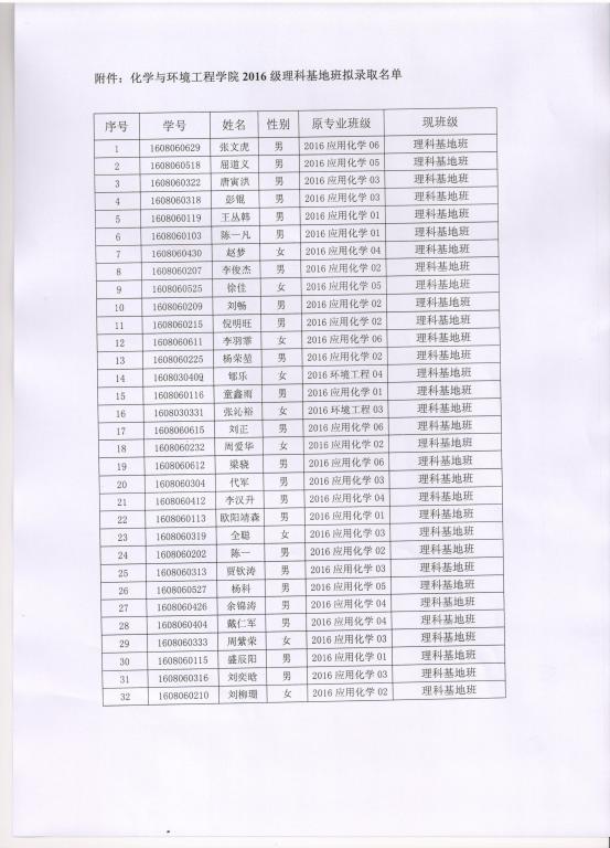 草榴社区 关于2016级应用化学专业理科基地班入选名单的公示
